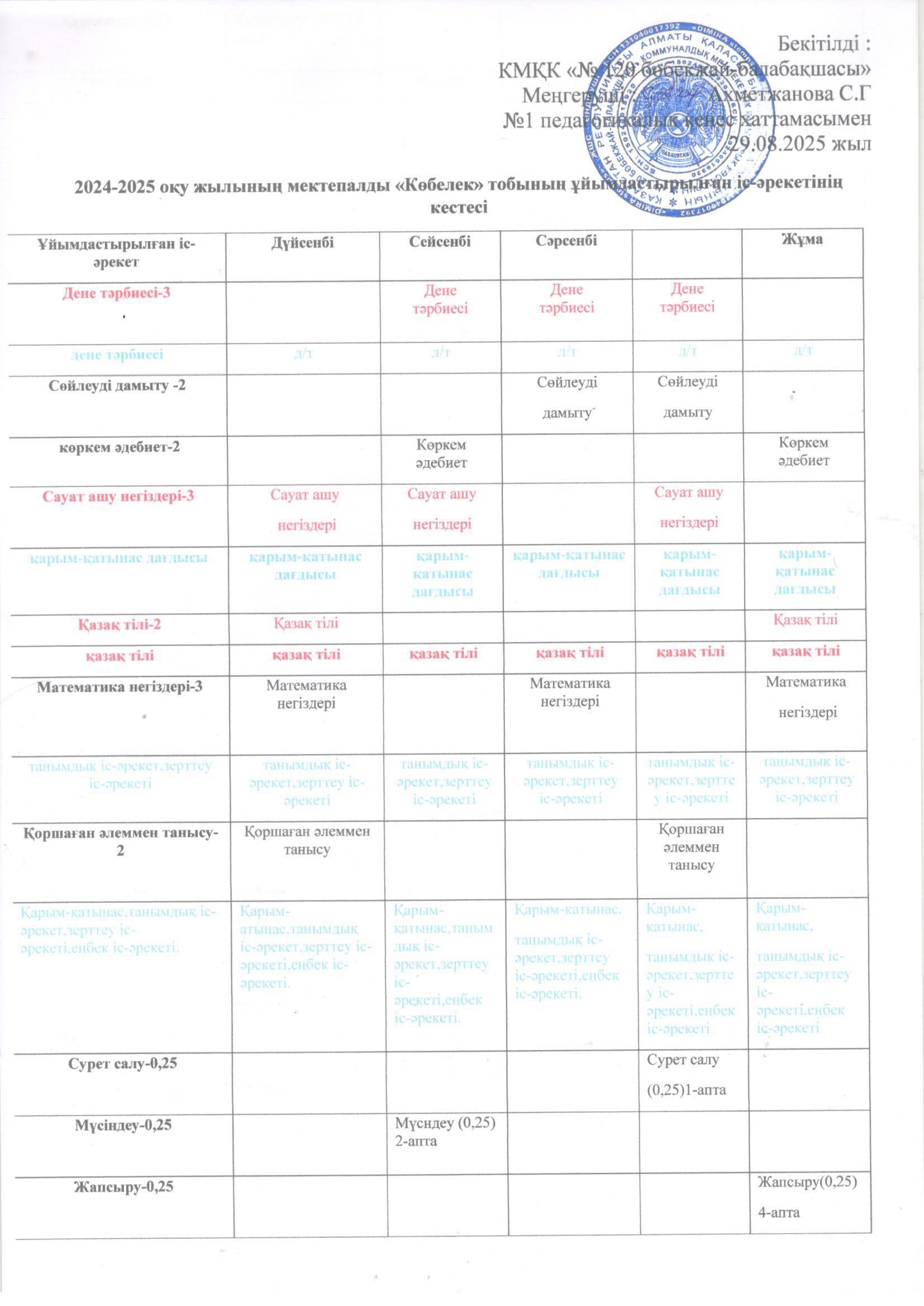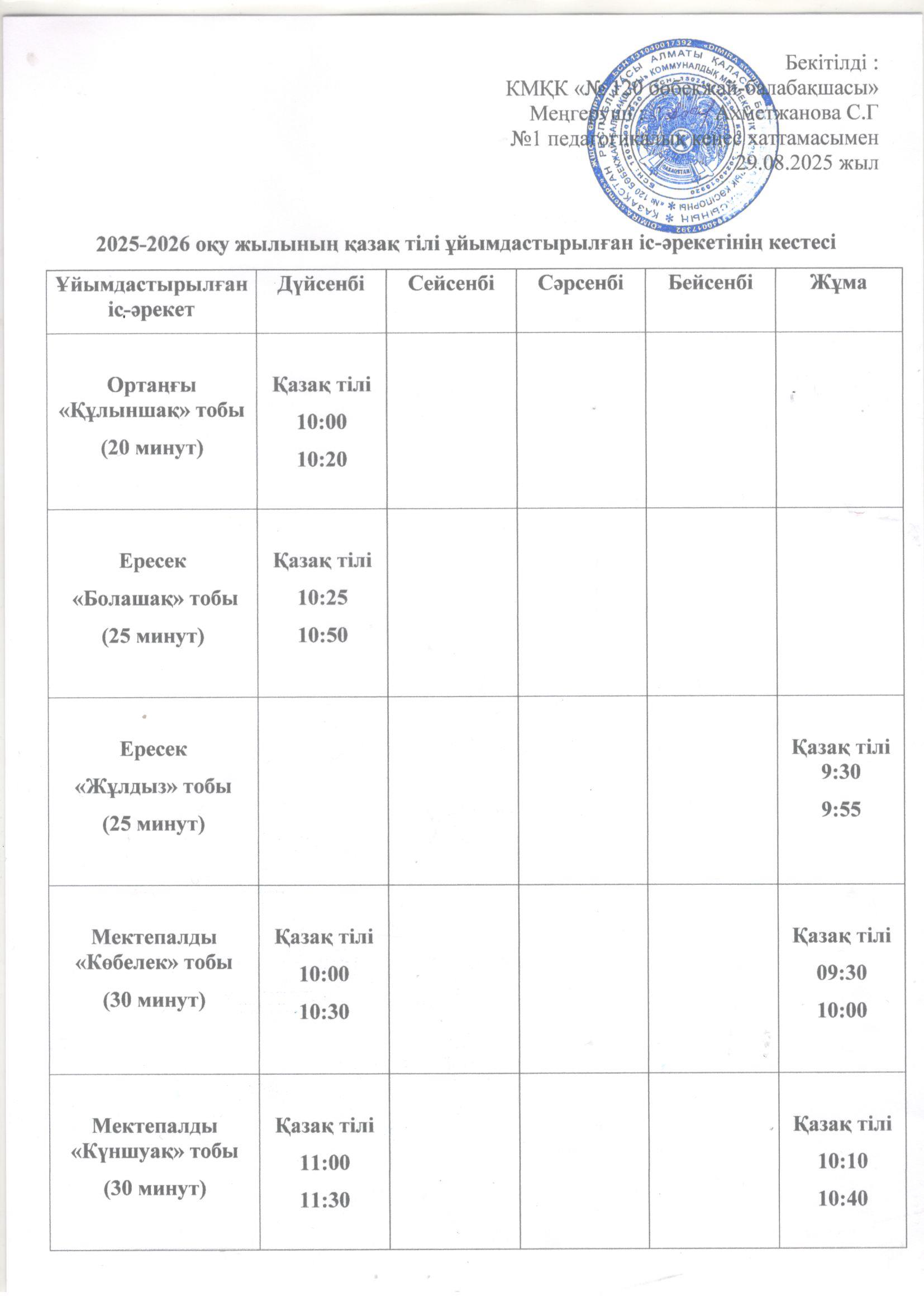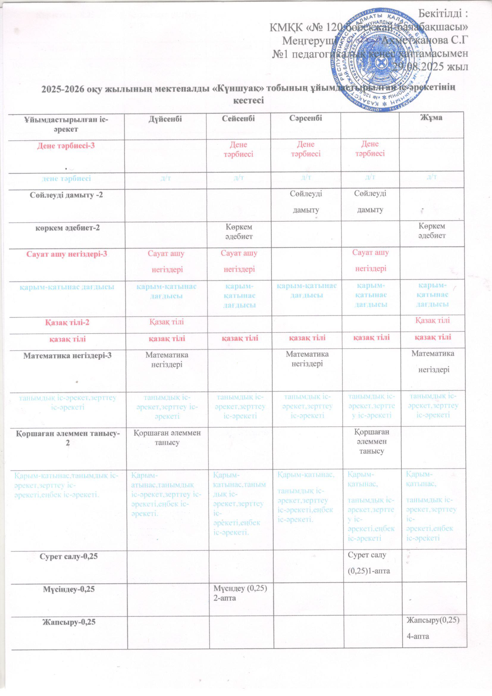 2025-2026 оқу жылының ұйымдастырылған іс-әрекет кестесі