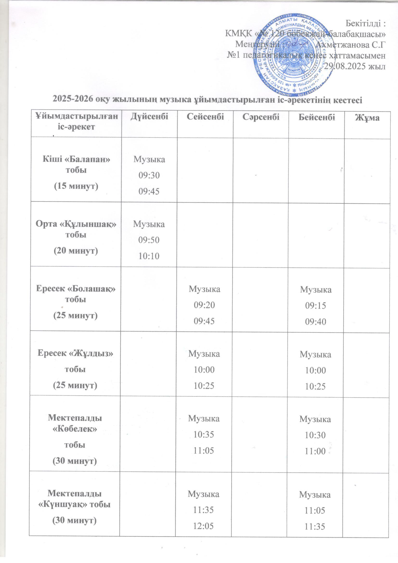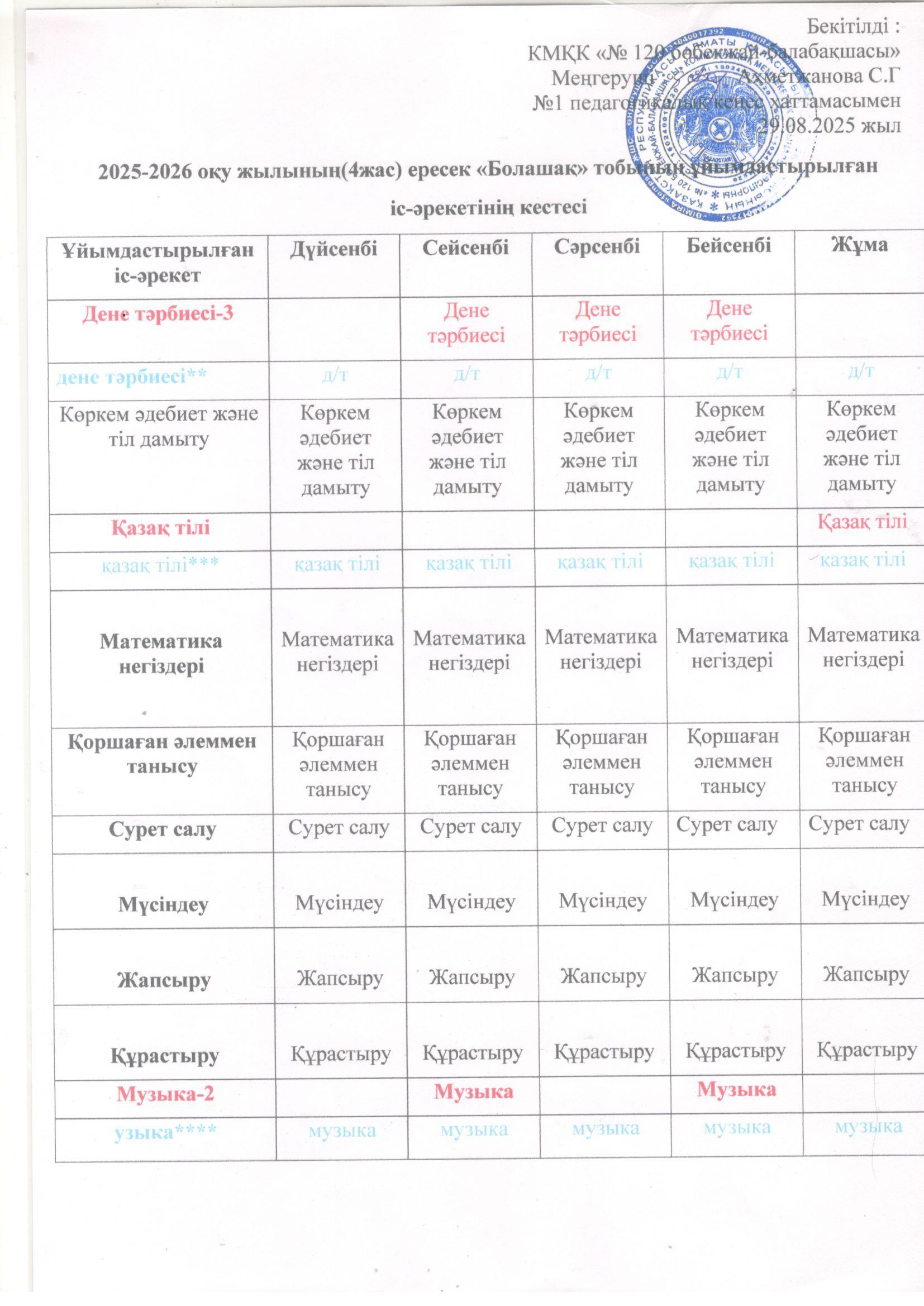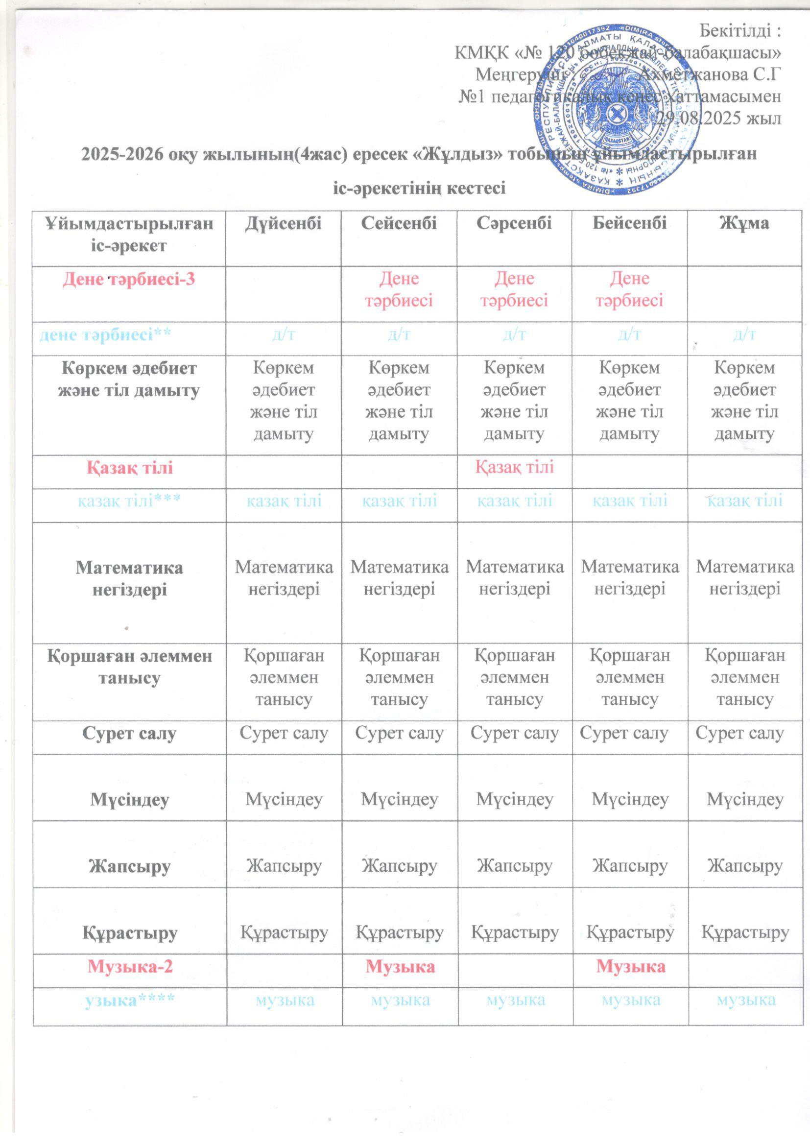 2025-2026 оқу жылының ұйымдастырылған іс-әрекет кестесі