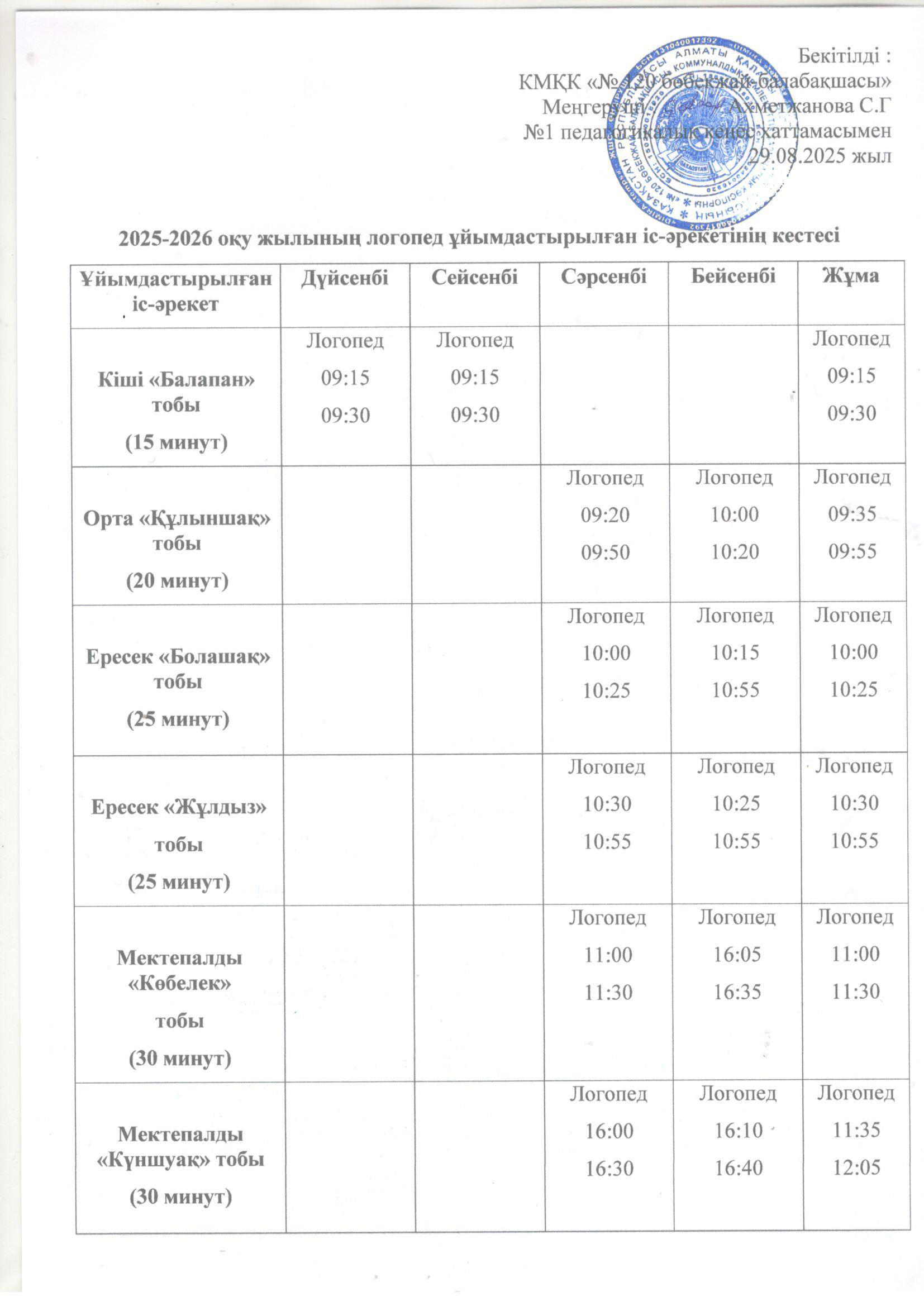 2025-2026 оқу жылына арналан консультациялық пункттің жұмыс кестесі
