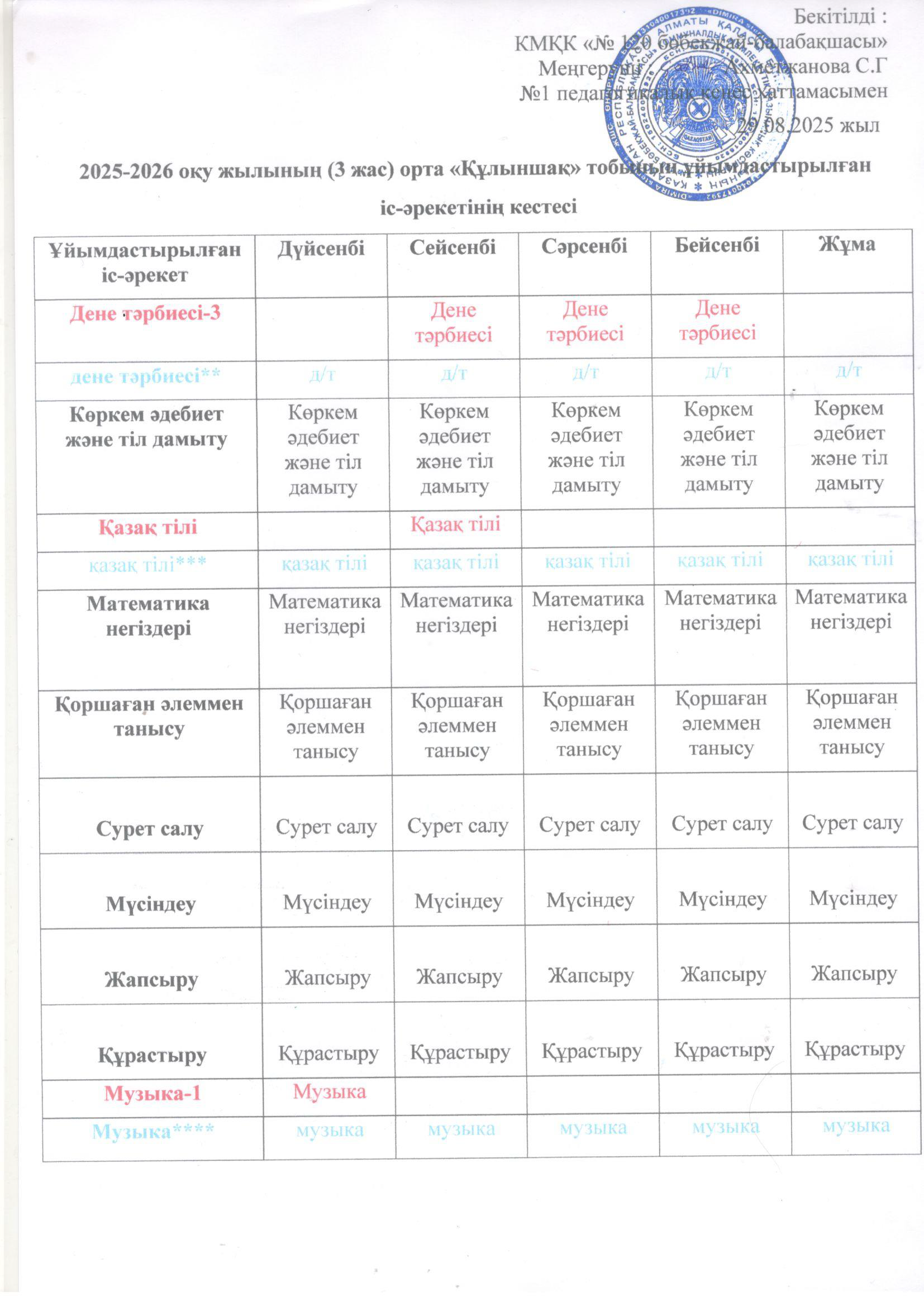 2025-2026 оқу жылының ұйымдастырылған іс-әрекет кестесі